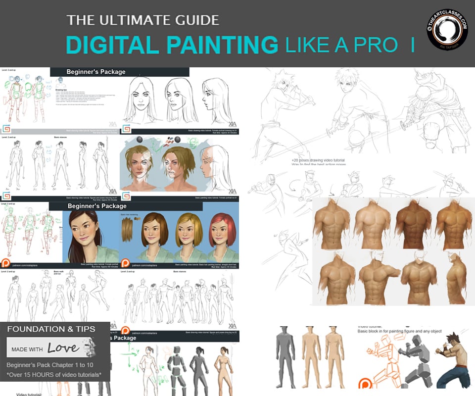 Digital painting tutorial: Beginner's Package chapter 1 to 10 Over fifteen hours of HD MP4 files (approx: 1280 x 720) and original PSD files. The ultimate guide for beginners and intermediates.